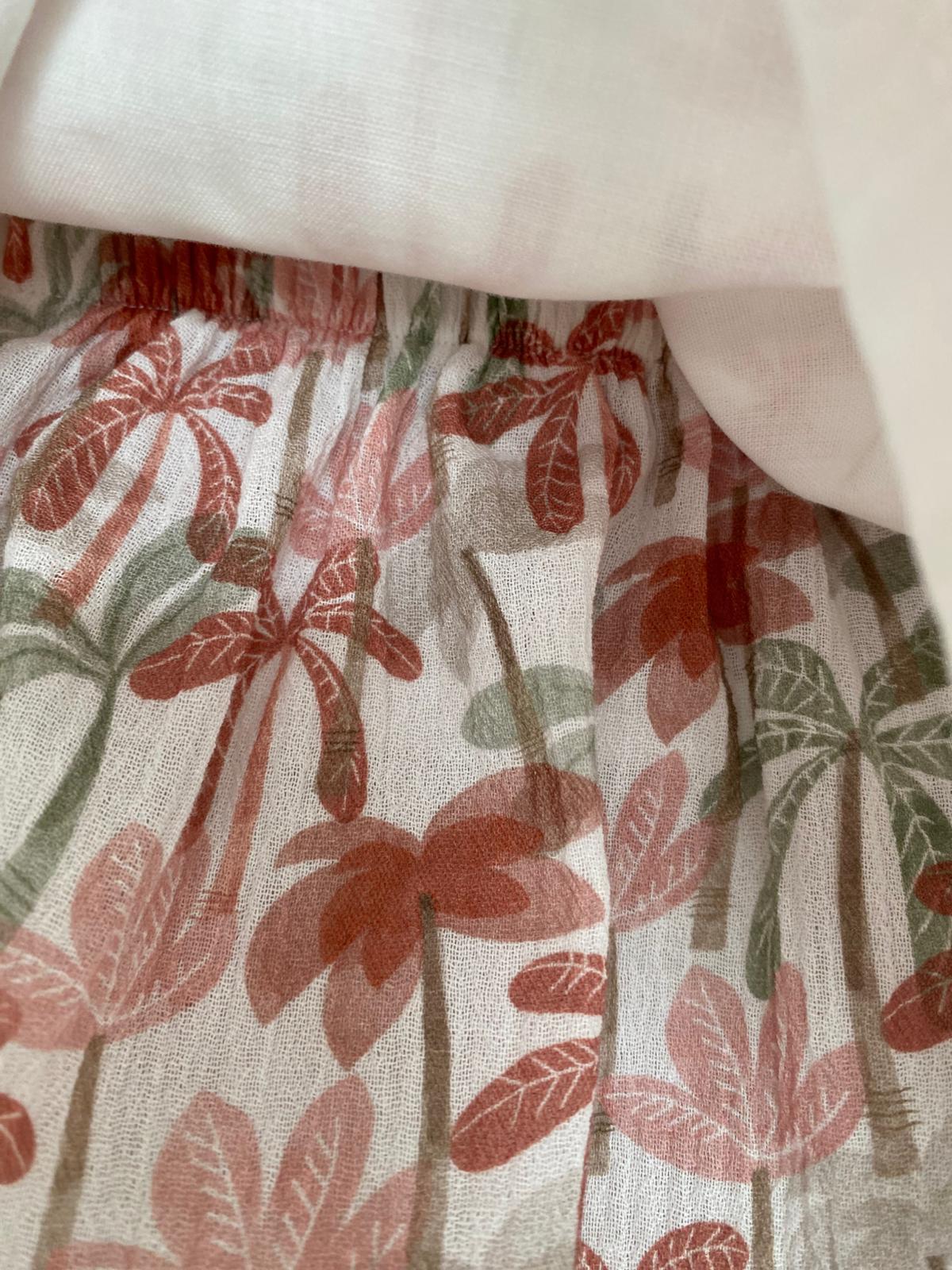 Lleva la serenidad tropical a la vida de tu pequeño con este vestido que respira naturaleza y ternura. Las palmeras danzan en una armonía de rosas delicados, ladrillo terroso y verdes frescos, colores que evocan la calidez de un paraíso tranquilo.